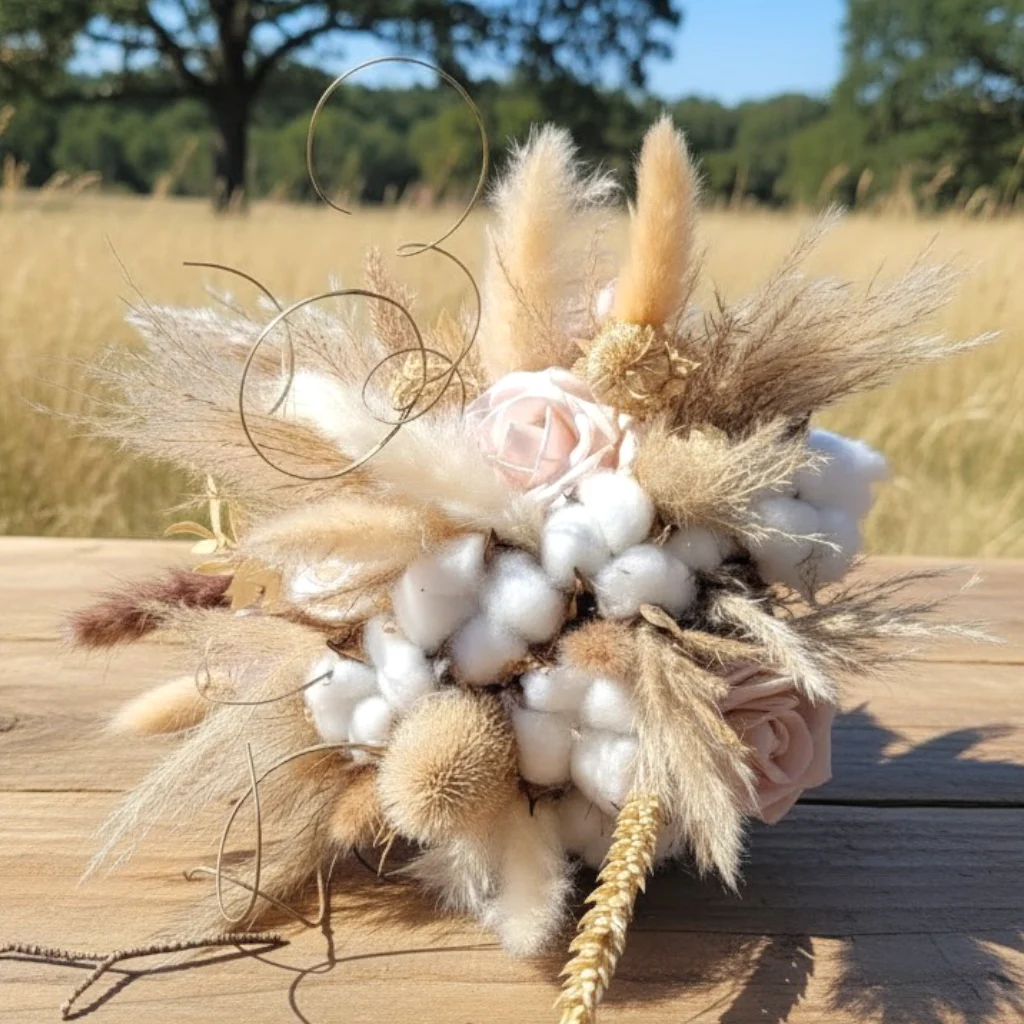 Un bouquet de mariée coton est un bouquet de mariage composé notamment de coton, de fleurs séchées, de pampas et de roses simulées. Il séduit par son style naturel, bohème et intemporel.